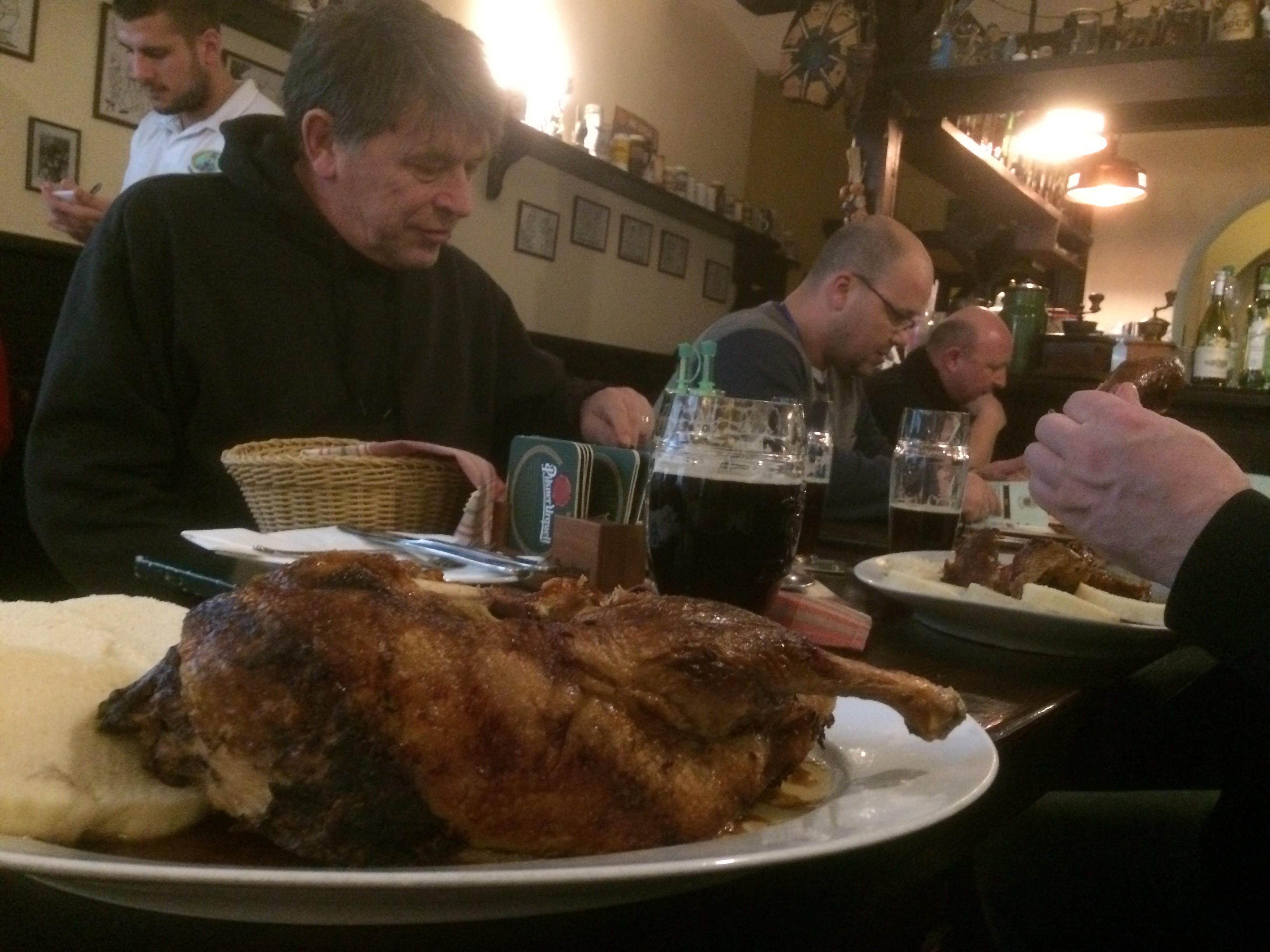 Beim Frühstück in der Elbhangpension Maria scheint der Tag für Fürst Fedja bereits gelaufen zu sein. Der Wodkartell-Boss zieht ein Gesicht, als würde er auf einer sauren Zitrone lutschen. Leckere Zerealien in O-Saft getränkt und dann taucht beim Napfrühren glatt ein verhasstes Dutzend Rosinen auf. Doch deswegen zur frühen Vormittagsstunde gleich wie ein Huhn ohne Kopf im Kreis herumrennen? Oh nein! Mit kulinarischer Erlebnisgier wird der Landschlachthof Struppen angesteuert. Es hagelt Knacker, es poltert die Leberwurst durchs Auto, das, von innen betrachtet, wie eine unsortierte Damenhandtasche ausschaut. Es soll ja in derlei Männer-Mysterien stets etwas kurios zugehen und manche holde Trägerin fühlt sich nur prima, wenn das halbe Interieur eines Bad- bzw. Kosmetikschrankes in entsprechend großen Behältnissen mit sich geführt wird. Darüber noch sinnierend, ist das nächste Ziel bereits in den Navigator eingegeben: Karlsbad. Eine Bretterwelt asiatischer Stände lädt zum Kippen-Shopping ein, dann ab durch den Schnee nach Becherovka-City. Im September 2016 fand hierher die letzte Stippvisite statt, damals speiste der Pratajev-Tross überaus lecker im Egerländer Hof.