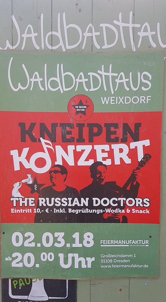 „Eintritt inklusive Begrüßungs-Wodka und Snack“ ist, oder besser gesagt: sind angesagt. Also: Nichts für tätowierte Schöngeister aus dem Poser-Katalog. Aufgetafelt werden unter anderem geschnittene Lachse an fulminanten Saucen, gebackenes Brot samt handgefertigter Pelmeni in einer Brüh‘ aus Huhn und was noch alles. Zwar keine Fleischspieße wie beim letzten Mal, aber sehr fein zubereitet. Und nach einem Holzlöffelschluck Borschtsch an Wodka, kann’s bald starten, das mittlerweile dritte Waldbad-Konzert der Doctoren. Ein Dank an Impressario Gerd an dieser Stelle, der das alles ermöglichte.