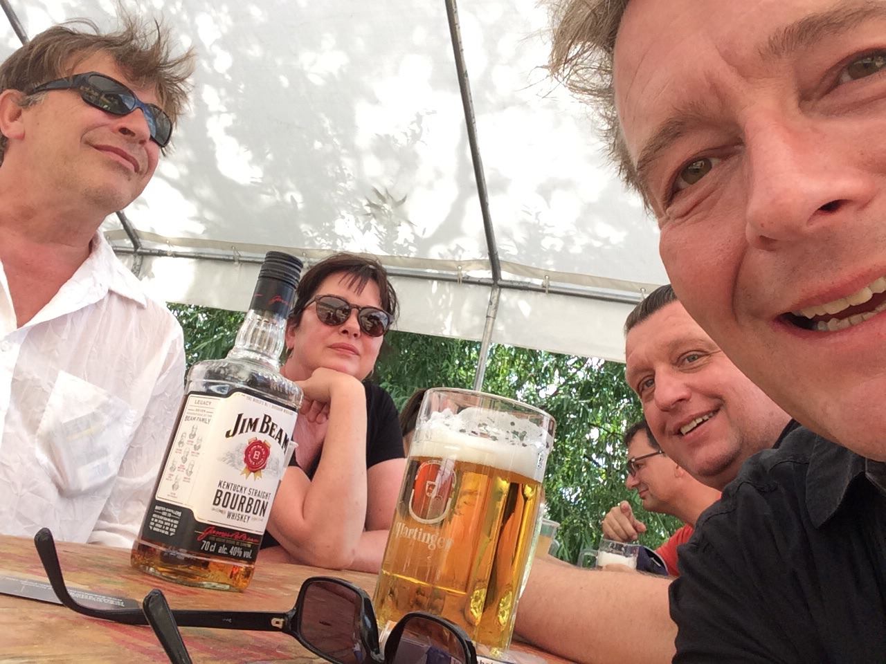 Die Zeit läuft einem bekanntlich deshalb davon, weil man sie sonst bloß totschlagen würde. In diesem Sinne frühstücken die Doctoren in aller Seelenruhe, während Fürst Fedja den Titel „Kapriziöser Schläfer des Vormittags (KSdV)“ erringt. Bis die Kippen im Parterre glimmen, wird das Hotelbuffet gleich dreifach heimgesucht. Immer noch scheint die gelbe Elbhangsonnne putzmunter ins grüne Tal; als Pichelsteins Gitarre um die Mittagszeit manöverfertig ist, geht’s per Fähre rüber nach Wachwitz. En passant wird in einer Klause verbrühtes, scharfsalziges, pampiges gefuttert, weiter geht’s mit verzerrten Mündern zur Grottenwirtschaft. Endlich ein Fischbrötchen! Mit Gurke und edler Kartoffelsuppe! Ein a priori-Stehsatz, der immer zählt: General Hunger ist ein großer Schurke auf Konzertreisen und wehe, wenn er nicht lecker zum Schweigen gebracht wird. Da wollen wir die Crew der Grottenwirtschaft um Professor Hendrik im Nachhinein dolle loben.