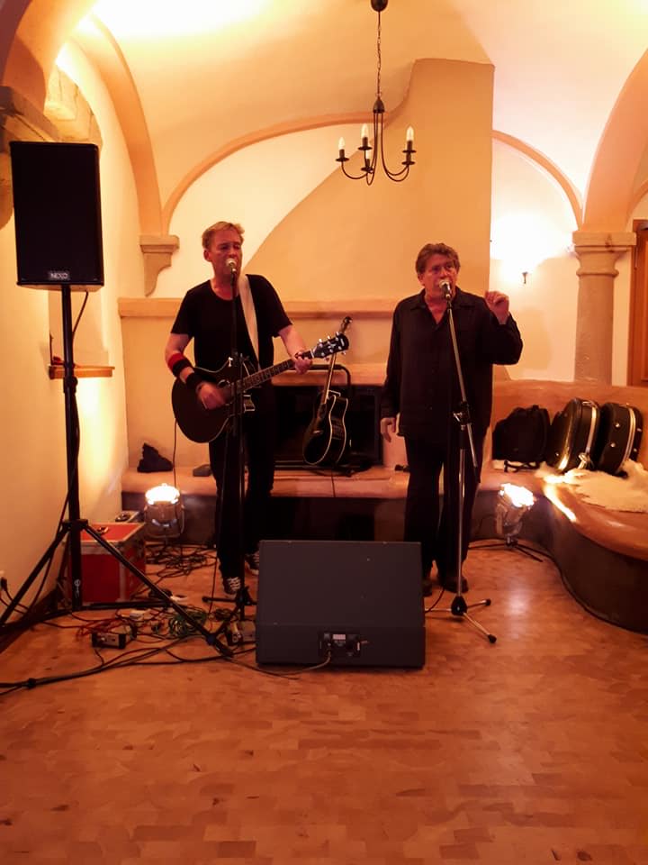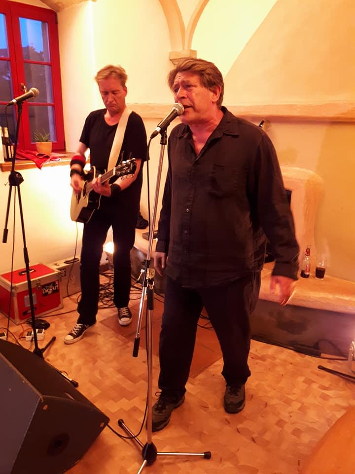 Kaum ist die familiäre Fotosession vorüber, stromert Fürst Fedja um die reichlich gedeckten Kochgaben herum. Während sich die Tische darunter biegen, wächst der Hungerast. Der Soundcheck ist am Ende gleich mehrfach getan; Mister Mixer fing nach jeder Endeinstellung wieder von vorne an, bis Doctor Makarios schließlich „bitte nicht mehr dran drehen“ rief und endlich in Feuerstellennähe gefuttert werden darf. Ein Lob den Köchinnen, ein Dank an die Gastgeber. Das Leben als Russischer Doctor hat schon seine Vorteile. Rasch einen heimlichen Verdauungsschnaps, pssst, nicht so laut, dann rauf auf die Bühne. Pichelstein schaut ein wenig leidend, rammte er sich doch am Vormittag das Metall eines Aktendullis in die linke Zeigefingerkuppe. Damit war zunächst gar nicht gut „Griffe greifen am Gitarrenhals“ – doch dank einer Kombination aus Ibuprofen, Sprühpflaster, Bulbash (heimlich), Fixomull und Sekundenkleber wird’s irgendwie schon gehen.