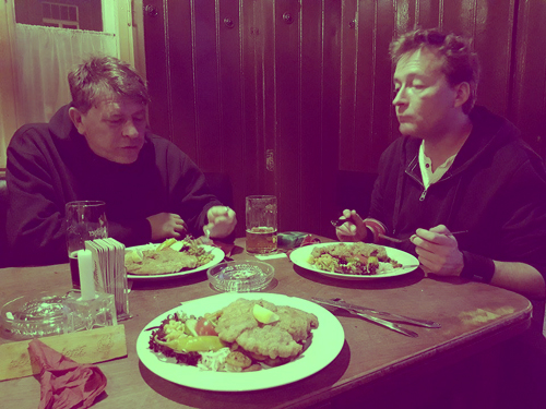 Ende. Ohne kirschrot zu werden. Braunschweig ruft. Mit einem Zwischenstopp am Karl-Marx-Stadt Borna Hp. Es gibt Kuchen. Makarios und Pichelstein sind glücklich. Es gibt eine Steckdose. Fürst Fedja ist glücklich. Zwischenzeitliche Handy-Ladeversuche am Zigarettenanzünderloch schlugen zuvor im Auto fehl. Jedenfalls: Das Ehrenmitglied der Pratajev-Gesellschaft „Der Tierarzt“ präsentiert mit besagtem Bahnhof einen neuen, potentiellen Ort gesellschaftlicher Feiermomente mit viel Auslauf ins Grüne. „Da müsste noch ein Zaun vor die Gleise, sonst laufen die Betrunkenen den durchfahrenden Zügen entgegen“, bemerkt Doctor Makarios fachmännisch. „Kein Problem“, ruft der Tierarzt und entschwindet zur ersten Operation an diesem nasskalten Freitag. Einer Katze muss der Schwanz teilamputiert werden, ein Reifen rollte drüber, nun hängt der Schweif in Fetzen. Gerne wären die Doctors bei diesem Ereignis zugegen, doch es geht weiter. Erst zur Tankstelle, dann direkt in den Stau vor Halle und schließlich in den Harz. Und während die ganze Zeit über Roland Kaiser singt (3 CDs, jeweils 16 Titel auf einer), wird der Traum von einem leckeren Grillteller immer größer, immer mächtiger. Fürst Fedja, Makarios und Pichelstein singen ihn dabei immer lauter, den Song vom Knopf, der zubleiben muss. Amore Mio! Bis er platzt. Nicht der Knopf, sondern der Traum vom Grillteller oder meinetwegen der Traum vom Forellenteller. Denn während bereits sommers sämtliche Restaurants im Nordharz um 20 Uhr schließen, setzt die Herbstsaison noch einen drauf. „Küchenschluss um 16 Uhr“ ist unweit der Burg Regenstein zu lesen. Leider ist es genau 16 Uhr und aus furios erwarteten Grilltellern werden im Einkaufscenter Blankenburg schlussendlich Klöpse und Leberkäse an Kartoffeln und letzten Nudeln.