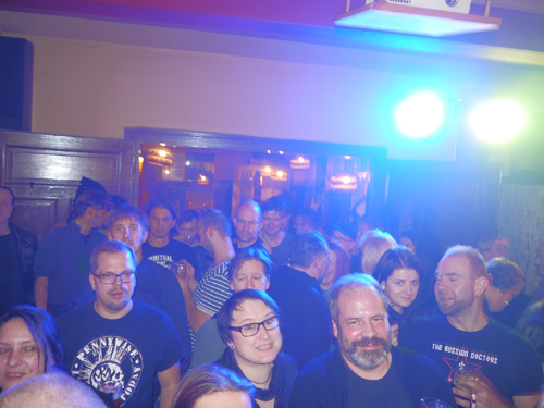 Nicht nach und nach, sondern schwallartig füllt sich der Saal. Einzelne sind kaum auszumachen. Wittenberg, Oranienburg, Teschendorf, Markleeberg, Torgau, Wismar, Berlin, Dresden, Magdeburg uvm. schickten Gemarkungsvertreter. Der Leipziger Pratajevsüden ist fast vollständig versammelt, auch Nord- und Westlinge tragen randvolle Krüge überm Holzboden spazieren. Schnitzel dampfen, Schnäpse tanzen und „Schlagzeuger und Linksaußen haben alle einen laufen“, sagt wer am Doctoren-Tisch mit weisem Lächeln. Langsam wird’s Zeit, sich gen Bühne zu trollen. Eines der CD-Intros auszusuchen, es zum Player zu tragen, um die Pratajev-Showtime anzukündigen, fällt aus. Es gibt einfach keinen freien Weg mehr, die Krause ist brechend voll. Also los mit „Wodka Wodka“. Der Reigen ist samt Kollabiergelegenheit eröffnet.