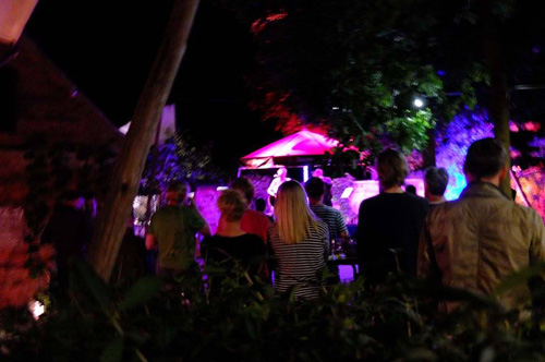 Idylle, ja. Es gibt sehr viel davon im Hof Nr. 14. Blumen explodierten in bunten Farben. Und Wein, selbst hergestellt, in Meißen gekeltert. Und Körbe voller Pfeffi- und Kirschlikör. Die Bühne steht bereits angerichtet wie der Watzmann vor dem Tal. „Aufi oder nit aufi?“ Nee, gleich, erst mal mit den Extrem Lugau-Veranstaltern Kaltgetränke verschnabulieren. Dann heißt es doch: Aufi mit großem Gepäck, Soundcheck. Mal schauen, ob der später hinzustoßende DJ einen USB-Anschluss vs. eine CD-Einlage fürs Intro in Petto hat. Hat er nicht. Denn das Equipment des Modern Man hinterm Digital sieht mittlerweile gar keine Umstände mehr vor. Da wird nur noch gedrückt und aus der Cloud gesogen. Doch keine Panik. Ein Vintage-Player ist schnell aufgetrieben. So sitzen die Doctoren auf eichenen Bänken, strahlen über alle Gesichter, als lecker marinierte Grillfrüchte, zubereitet über glücklichen Kohlen, aufgetischt werden. „Darf’s noch ein Getränk sein?“ fragt eine zarte Wirtinnenstimme. „Ja, aber ja, danke…“ Der Hof füllt sich, bald sind es gut 100 Gäste aller Altersklassen. „Die haben bestimmt noch nie etwas von Pratajev gehört“. „Das wird so sein“, sagt ein Doctor dem anderen. „Dann spielen wir heute Hitparade. Nur das geprüft Allerbeste“. Genauso kommt es auch, gegen 22 Uhr ist Schluss mit grillenchillen, fegen die Feldmänner wie donnernde Kanonen über den fackelerleuchteten Hof. Passend dazu brennt nebenan ein Feuerwerk ab und schießt kiffende Zwerge ins All.
