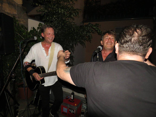 Im Hof frohlocken bereits dynamische Menschen. Da wird Soljanka kredenzt, aus Gläsern und Flaschen getrunken. Man herzt sich und ist in überwiegender Sauflaune. Als die Doctors auf der Bildfläche erscheinen werden Toasts ausgebracht. Schon eilen die Tatkräftigsten Fürst Fedja hinterher und schleppen die Anlage zur Beschallung des Publikums samt Backline empor auf die Hutbühne. Dann müssen Kaltgetränke her, die Sonne meint es gut, die Sonne macht Durst. Gegen den großen helfen bekanntlich mächtige Gläser und gegen den kleinen Durst winzige. Pichelstein besticht darunter in der Kunst des Aufbauens, schon darf gesoundcheckt werden. Erstmals wird geprobt: Das Titelstück zur neuen Platte, „Der wilde Bursche“ und ein paar Schmankerl mehr. Weltpremieren in Pirna! Was tut man nicht alles dafür, sogar proben.