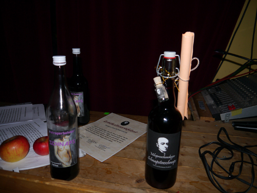 Unterdessen bereitete Doctor Pichelstein die Livebühne vor. Ein Kraftakt, denn die angekündigten NBL-Herren Barmann und Techniker liegen noch im Samstags-Tee. „Unseren Barmann hab ich heute Morgen noch um 9 Uhr im Seltsam um die Ecke gesehen. Der kommt sicher gleich“, erklärt dazu der Chefwirt gegen acht. Und weil sich das Wohnzimmer bereits streng füllt, müssen die Gäste eben selbst ran. „Striche einfach auf den Zettel, Geld in die Kasse“, so die Parole, und alle sind sie ehrlich. Denn das währt ja bekanntlich am Längsten. Und so wird es voller und voller. Doctor Makarios greift zur Lesebrille, erklärt noch wundersame Dinge um die ausgestellte Pratajev-Kollektion, der Vortrag „Die Bedeutung des Kürzels π“, cd-vorgetragen durch den mittlerweile verstorbenen, rührigen Peter Glathe aus dem Jahr 2000, folgt und dann ist Doctors-Time.