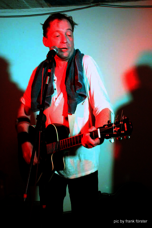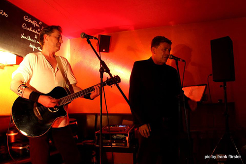 Wieder ist’s wie am gestrigen Tage. Als eine bereits vorinstallierte Bühne freudig zur Kenntnis genommen wird, zischen sich erste Kaltgetränke mühelos wie von selbst. Diesmal gebührt der Dank dem begnadeten Technikus Eric. Nach dem Soundcheck gibt’s leckere Häpperchen und Päpperchen mit Gürkchen oben drauf. Satt bis zufrieden kann’s Konzert somit beginnen. Schön. Man muss nur sitzen, schwatzen, trinken und warten. Die Tische füllen sich – aber keine Sorge: es wird kein Sitzkonzert werden. Wir sind ja schließlich in Dresden und nicht, na ja, dort, wo die Leute eben (warum auch immer) Sitzkonzerte präferieren. An ein öffentlich zugängliches, bestuhltes Elbflorenz-Konzert in den letzten Jahren kann sich auch zuweilen niemand erinnern. Pirnas Gleichstellungsbeauftragter der Pratajev-Gesellschaft versucht den fränkischen Worten der aus Nürnberg angereisten Hufschmiedin zu folgen und scheitert. Mit großem Hallo wird die Grottenwirtschafts-Gemeinde begrüßt und so werden es am Ende knapp über 50 Gäste. Das ist schon viel für diese Gegend (außerhalb des Elbhangfestes), denn Loschwitz zu erreichen ist die eine Sache. Loschwitz mit öffentlichen Verkehrsmitteln wieder Richtung City oder meinetwegen Struppen zu verlassen, eine nachts schwer zu stemmende Angelegenheit. Doch soweit die Füße tragen sind wir noch nicht, zunächst gibt’s das Handzeichen vom Eric: Intro ist scharf gestellt, kann losgehen.