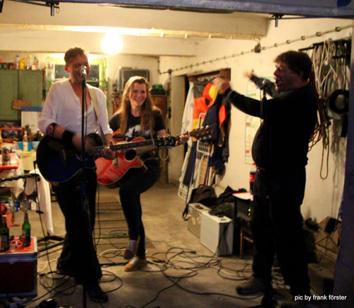 Die Technik steht, der Garten ist proppevoll. Lange nicht gesehen: Die Dame Ane und Spaniens Leonard Emaro. Natürlich – es wird über den 3. Pratajev-Film gesprochen, gemutmaßt und vielleicht sollte es ihn wirklich noch geben. Eine herzergreifende Anmoderation folgt, Geschwätzigkeiten enden. Steffen Birnbaum stellt die einzelnen Künstler qua Laudatio vor, Assistentin Franziska verteilt Sonnenblumen und hernach feuert das Intro aus den Boxen.