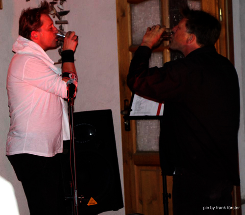 Es ist immer wieder eine große Challenge, sich neues Publikum erspielen zu dürfen. Der überwiegende Teil der Kunstfreunde hat vor diesem 25. Juli 2015 noch nie ein Pratajev-Gedicht gelesen, geschweige denn sich ein Lied der Russian Doctors ins Ohr gestöpselt. Doch heute ist es, wie es eigentlich immer ist: die anfängliche Skepsis weicht rasch und dank Makarios‘ poetisch-praktischem Erzählritt gelingt der Pratajev-Parcours ab 20 Uhr ohne Pause mit Wodka-Sahnehäubchen obenauf. Nach mehr als zwei Stunden sind wieder einmal knapp 40 Weisen gespielt, Mundschenk Fürst Fedja sorgte zwischendrin mit ausreichenden Gelbschnapslieferungen für Belohnungsmomente bis zur letzten Zugabe, die bereits in tiefster Dunkelheit gespielt wird. Dann erlischt das Scheinwerferlicht, wird’s Backstage ein Middlestage und manch einer möchte mit den Doctoren unbedingt noch wohin, ins Cafe Westen vielleicht, ins NBL. Aber nein, sagen sich da die Herren Makarios und Pichelstein: für heute muss es reichen, die Arbeit ist getan. Noch ein letzter Gelbschnaps, dann nichts wie ohne Umwege ins sanfte Weich.