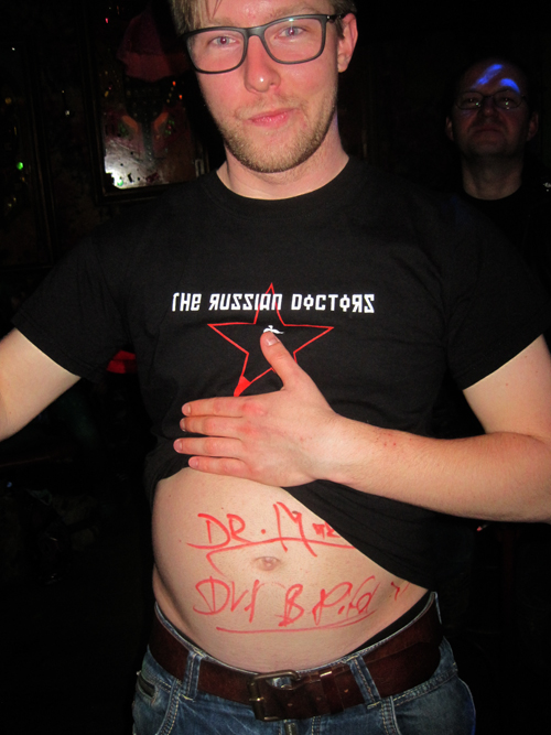 Zwanzig Minuten später brechen alle Dämme bereits beim Rotarmisten und so peitschen sich die lieben Menschen im Rund in den Zugabeblock hinein. Eademakows Brotschnaps aus dem Erzgebirge fließt körnig, souverän meistern die Docs ihr erstes Mittelwellenkonzert in der mittlerweiweile 12-jährigen Geschichte. Dann heißt es: Raus an den Schnapsbar, Poster unterschreiben, Bäuche unterschreiben, Vergabe des feuchtfröhlichen Titels „Weitgereiste Doctors-Entourage“. And the Winner is: Nürnberg! Ein ganzer Bus voller Franken. Herrlich! Man möchte sich vor Freude, ganz im Sinne Helga Bauers, eine Kette aus frisch gepflückten Hagebutte um den Hals binden und schicklich damit leuchten.