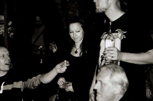Nachmittags führt Gastgeber Nikolaj Plautski große Teile des Komitees auf den spätsommerlichen Weihnachtsmarkt. In einem Städtchen, kurz hinter Amerika gelegen, findet er tatsächlich, wenn auch nur für einen Tag, statt. Das Altenburger Land hält sonderliches bereit. Nichts desto Trotz bestellt sich jeder der Pratajevianer ein Tässchen Glühwein in der Sonne. Dazu gibt's eine Thüringer Roster vom Grill. Die Bauchtanzgruppe, geschmückt und bestückt wie der Heilig-Abend himself (Gänsebraten, Lametta und all das, von wegen Kartoffelbrei und Würstchen. Frevel!) lässt die Doctoren bass vor Staunen beinahe Senf aufs Hemdrevers kleckern. Ein fotogener Stopp am Bahnhof von Amerika folgt, im Örtchen weiter lockt der Süßhunger. Die Kellnerin der Kaffee-Bar fürchtet sich ein wenig vor den schwarz gewandeten Gestalten, die mit gierigen Fingern auf Tortenauslagen deuten. „Nicht, dass ich heute noch überfallen werde“, gibt sie zu bedenken. Fürst Fedjas beruhigender Sonor beschwichtigt sie während um die Sahnestund‘ herum dem Altersdurchschnitt im Café nahezu jugendliche Statistik anheimfällt. Dann auf und zurück gen Heimatverein Göpfersdorf. Die Bühne wurde bereits gerichtet, die Getränke stehen kalt, fleißiges Volk kümmerte sich derweil ums kulinarisch, russisch angehauchte Programm.