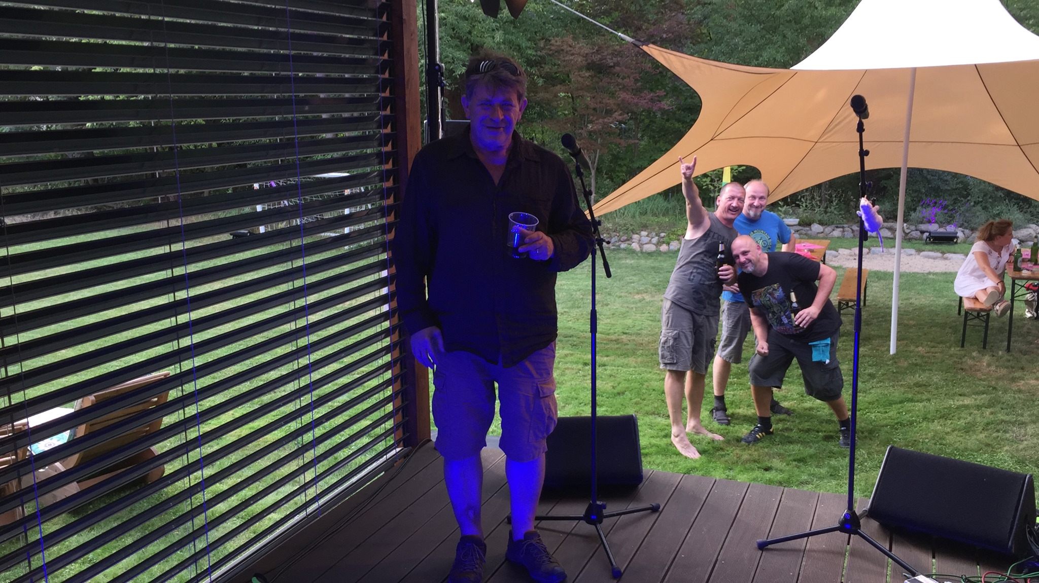 Nach einer Welle von Kaltgetränken, leckerem vom Buffet nebst göttlicher Grill-Ernte spielen die Docs ein erstes Set und tatsächlich taucht nach wenigen Minuten einer dieser neuen Nachbarn auf. Keiner hat ihn je zuvor gesehen. Ein Schwabe mit übertriebenem Ego mitten in Zeesen? Möglich wäre es. Die Docs ficht das nicht weiter an, das Set spielt sich wie von selbst.