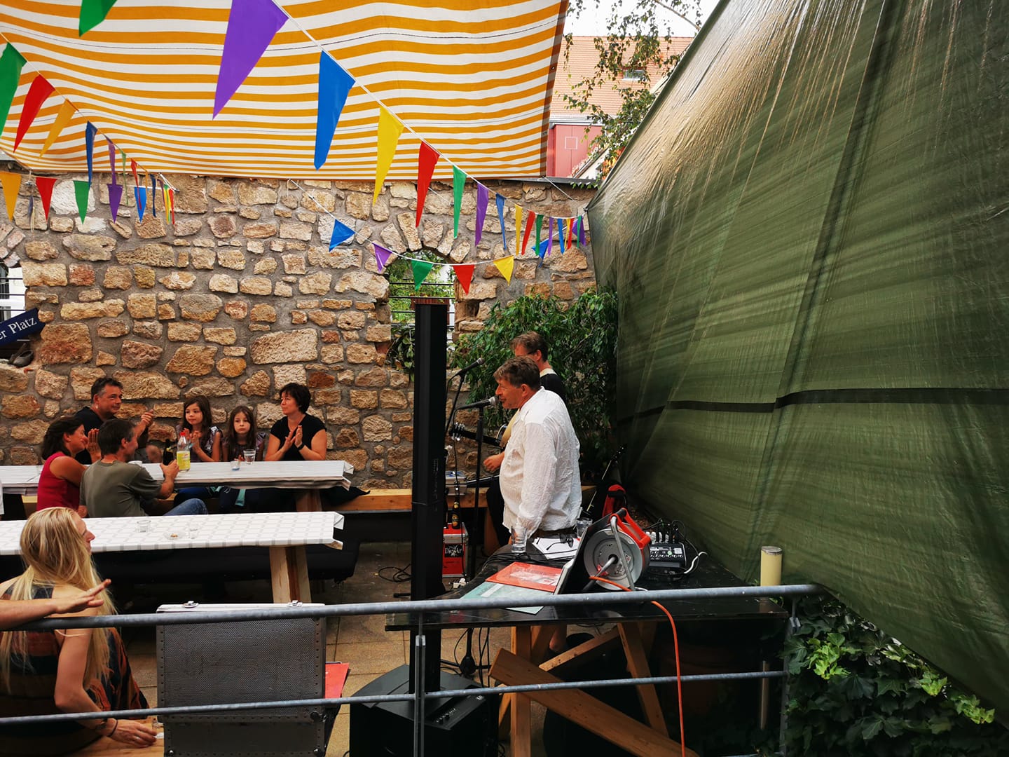 Die haben mitunter das Ziel erreicht, Kaltgetränke schnabuliert, die Bühne aufgebaut und danken im Nachgang der Ulf-Crew fürs schwere Schleppen mitgeführter Gerätschaften. Sehr erfreulich ist zudem, dass einige Mitglieder der Jüdischen Gemeinde Pirnas anwesend sind. Shabbat Shalom! Sobald es dunkelt, muss gesungen und gefeiert werden. Auch die Jubilarin freut’s, es wird angestoßen bis die Becher bersten. Doch da es noch hell ist und erstaunlicherweise keine Gewitterausmaße wie in den Jahren zuvor den Hof fluten, sind die Erben Pratajevs als erste dran. Mit Bulbash an den Lippen stimmt Pichelstein Gitarren, während Makarios die Sonnenbrille absetzt und für immer verlieren wird. Ungewöhnlich ist das nicht.