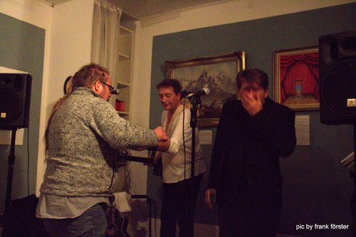 Zwei Stunden später ist kurz vor Wegesende das Braunschweiger Einbahnstraßenmodell mit seinen erschreckend kurzen Ampelphasen überwunden. Alex Andra kredenzt heiße Würstchen und Gnocchi-Salat am Holztisch bevor der heutige Auftrittsort ins Visier gerät, die Galerie „einRaum5-7“, knapp 30 Quadratmeter groß. Eigentlich war das Theater Lindenhof das Ziel, doch es muss unmittelbar nachdem Plakate und Flyer gedruckt und verteilt waren, Streit gegeben haben. Die Braunschweiger Zeitung berichtet in großen Lettern „The Russian Doctors im Theater Lindenhof“. So ein Pech aber auch, beziehungsweise: Sei eine Möwe und scheiß drauf. Kurzum: das Publikum trägt schwer daran, die Erben Pratajevs in der Eintracht-Metropole ausfindig zu machen. Doch jene tapferen vielleicht 25, die sich durch den nassen Herbstwind im Laufe des Abends hierher verirren, werden großes erleben, ein Feuerwerk russischer Zange, vor Freude flirrende Stimmen und ein Gitarrengewitter, das sich gewaschen hat.