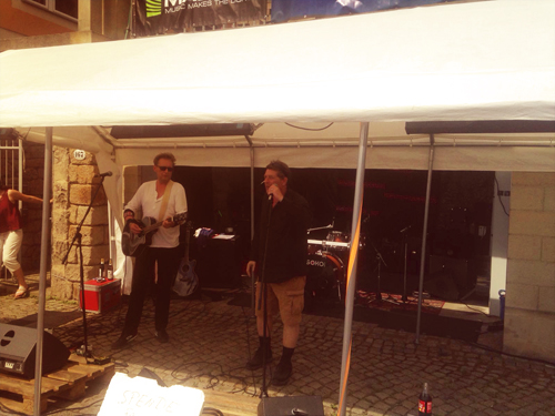 Für 15 Uhr ist die Doctoren-Showtime angesetzt, die ärzte-affinen Musiker der Kapelle Soko Rock besangen gerade noch den Travestiekünstler Ernst-Johann Reinhardt („Lilo Wanders“), schon werden Kabel verlegt, der Schweiß fließt besonders bei Doctor Pichelstein. Die Idee, unbedingt in einer langen, schwarzen Hose lustwandeln zu wollen, hm, die war in Grädern Celsius gemessen eher dümmlich. Makarios trägt kurzes Beinkleid, lacht glockenhell wie die Sonne und freut sich über jede vorbeiziehende Wolke. Der Sieg der Portugiesen wirkt nach. Klar, dass darauf weiterhin getrunken werden muss und während sich die Menschen im Rund vor der Straßenbühne vermehren wie sommers die schönsten Rosen auf dem glitzernden Teich, gelingt beim Soundcheck eine dezibeleske Vervollkommnung. Schon läuft das Intro tief und kehlig: „Warme Worte zum Geleit“. Pratajevs Erben folgen den Gesetzen der Physik: Eine eloquente Eigendynamik, bestehend aus Gitarrengewittern und Weisen des großen russischen Dichters, ist (einmal losgetreten) nicht mehr zu stoppen. Sie steigt an, die Dynamik, steigert sich zum Diskant, erreicht ein Plateau und von hoch droben folgt ein Sprung in die Tiefe. Oh, wie das kribbelt! Als würde man im Traum von einem Hochhaus fallen. Und während es so kribbelt, heißt es auf der Bühne nur: „Das waren die Russian Doctors!“