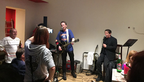 Die Doctoren werden bei Ankunft mittels Vollglasmodus willkommen geheißen. Es ist später Freitagnachmittag und eine Publikumshälfte scheint dem reichhaltigen Ausschank bereits kräftig zugesprochen zu haben. Die andere Hälfte, mutmaßlich eben erst eingetroffen, bemüht sich kräftig aufzuholen. „Wer trinkt, muss essen“, lautet ein altes Balkansprichwort. Flugs ist das Buffet eröffnet; auf einem der Flachbildschirme laufen Videos der Russian Doctors in Endlosschleife, aus dem anderen stöhnt Damentennis.