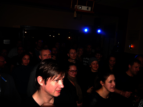 Wen soll man alles aufzählen? Wer ist heute da? Ach, lassen wir’s. Alle. Von der Plüschblinkrattenliga bis zur Holzlöfflerfamilie über die Karl-Marx-Stadt-Rosa-Eimer-Fraktion einfach alle. Tierärzte, der Club der schönen Mütter, Lehrer, Schüler, Techniker, Ingenieure, Ärzte, sehr junge Schwestern, Bäcker, Psychologen. Biberzüchter, Verleger, Tüftler (Ja! Ein Pratajev-Spiel wie beim Monopoli! Das fehlt der Welt! Die Karten lesen sich vielleicht so: „Du hast in den Froschteich von Miloproschenskoje gepullert und bist dabei von Kommissar Igor Pavlowitsch mit Schrot beschossen worden: zweimal aussetzen und darunter 17 Bulbash-Schnäpse mit den Veterinären aus Murmansk trinken“) …. Und wer nicht kommt, der trägt gute Gründe vor, hat hohes Fieber oder leidet unter einer schwarzen Haarzunge. Und wer nicht kommt zur rechten Zeit, der muss Pogo tanzen, um vor der Bühne anzukommen. Die gute alte Liebe Frau Krause platzt bereits lange vor dem Intro aus allen Nähten. Die Wahrscheinlichkeit heute einer trunkenen Kollarbiergelegenheit anheim zu fallen, liegt beim Gros der Gäste im 100%-Bereich. Den Ausreißer nach oben gibt heute der Hausmeister. Aber das ist okay so, schließlich macht er sich gleich auf zu den Kollegen der Dritten Wahl ins Werk2. Ob er dort jemals ankam, ist nicht überliefert.
