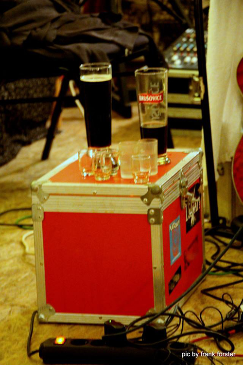 Ist das gemein. Die Sonne strahlt gelb, dick und zufrieden wie ein betrunkener Chinese am südseeblauen Himmel. Nur warm wird einem drunter nicht. Die Russenpeitsche hat weite Teile der bunten Republik unter ihrer Knute und die Doctors frieren beim Einladen des Equipments sehr. Gleich danach geht’s zur Bockwurst an die Total zu Studier- und Probierzwecken. Studiert werden die typischen Tankstellenkunden einer größeren Stadt (das sind keineswegs die langweiligen Tanker, sondern mehr so Menschen mit vom Schnaps demoliertem Gesicht). Probiert werden, na klar, Bockwürste mit goldigem Senf. Kein Tropfen davon landet in den schwarzen Textilien. So ein Glück. Für die nächsten zwei Stunden gilt es erneut, Sächsischunterricht zu nehmen (Pichelstein) und Frank „The Tank“ im Angesicht schrecklich fahruntüchtiger Autobahngesellen am Steuer zu beruhigen (Makarios). Denn wie heißt es so schön in irgendeinem Wiglaf Droste-Buch? „Geduld ist eine Rüstung, die nicht jedem passt“. Was mit der Rüstung indes geschieht, wenn sie platzt, wird dortselbst nicht weiter verraten. „Der wartet wohl auf ein besonders schönes Grün“, hört man hingegen den Driver of the pack an einer Ampel fluchen. So brausen sie dahin, nach Berlin-Karow, Pankgrafen- und Streckfußstraße wurden keck ins Navigationsgerät getippt.