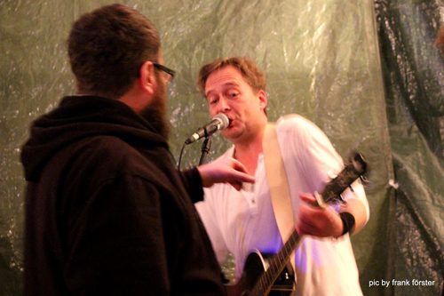 Dank DJ Thomas ist die Bühne bereits gerichtet. Der Blutgitarre des gestrigen Krause-Abends fällt Bewunderung anheim. Ständig muss Pichelstein die Finger vorzeigen, besorgt wird gefragt: „Kann man damit spielen?“ Und ob man kann, schließlich besteht der halbe Medizinschrank der tourenden Erben Pratajevs aus einer Ansammlung diverser Pflaster- wie Fixomulldreingaben. Woraus der andere Teil besteht, wird indes nicht verraten. Verraten wird nur, dass großes Geschick dazugehört, derart bepflastert zu Werke gehen zu können. Wo doch DAS Gitarren-Plektrum ständig an einer Unebenheit zwischen den Fingern hängen bleiben möchte. Die Kunst besteht einfach darin, während des Schnellspielens mit drei bis vier leicht dehnbaren Ellipsen in Händen loszulegen. Am Ende vom Lied hält man vielleicht nur noch ein einziges Plek zwischen den Fingern. Die verlustig geflogenen werden aufgesammelt und weiter geht’s.