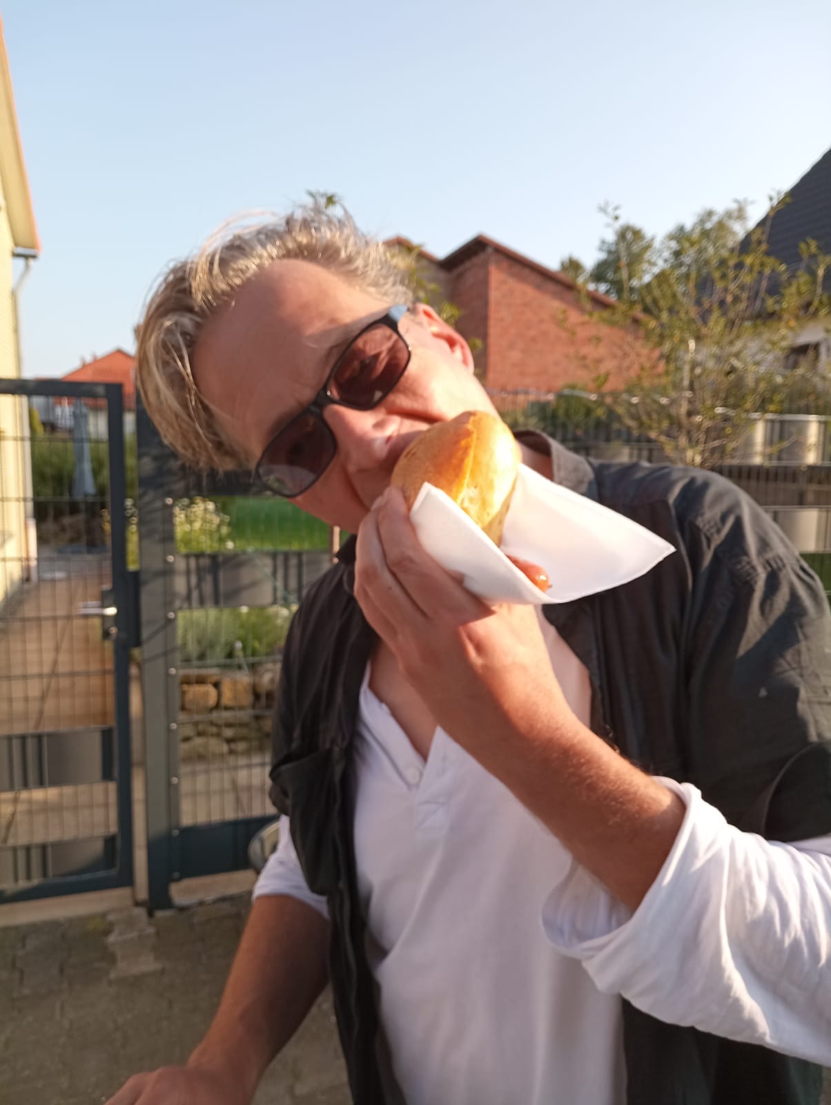 All das fußt auf ein lang vergangenes, sonntägliches Prenzlauer Berg-Konzert im Dunckerclub. Beide Gastgeber lebten damals in Berlin. Und nun eben samt Gattinnen hier. Darauf eine Grillwurst! Wie heißt es noch so richtig? Gute Grillmeister sind die Retter der Welt. Wenn sie darunter noch Erzeugnisse vom lokalen Landfleischer verwenden, ist ein Übermaß an Zurückhaltung schwerlich zu erkennen. Hier der Beweis: